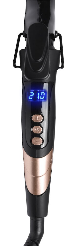 Professioneller Lockenstab, 25 mm Durchmesser, mit Abschaltautomatik nach 60 Minuten. Digitalanzeige zur Temperatureinstellung, 120 °C – 210 °C. Das 2,5 Meter lange Kabel verfügt über ein 360°-Kabeldrehgelenk sowie über eine praktische Aufhängeöse. 220-240V.