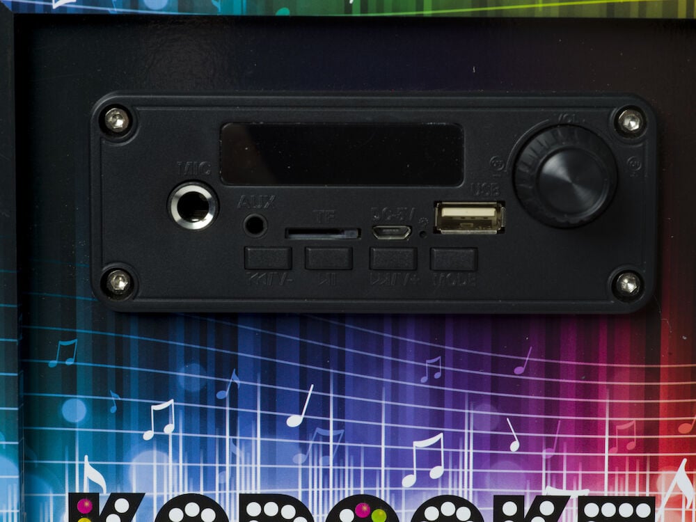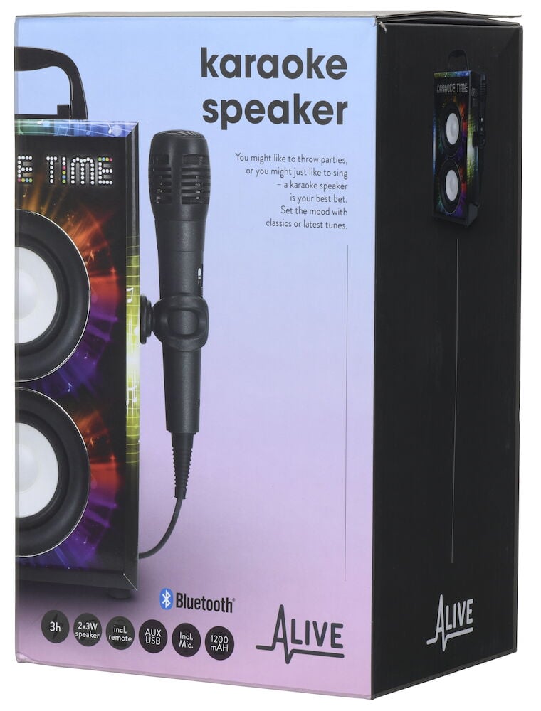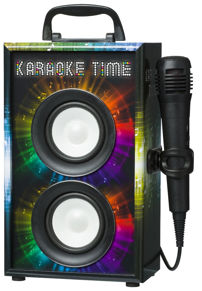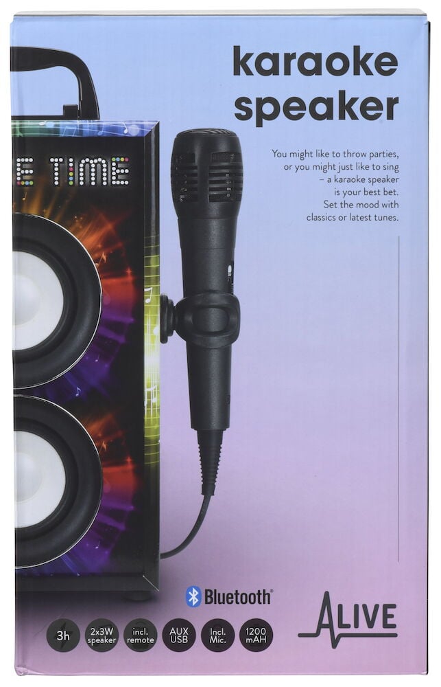 Karaoke-Lautsprecher mit Mikrofon, Radio und Fernbedienung. Mit AUX-, USB C- und TF-Anschluss. AUX-Kabel enthalten. Ist wiederaufladbar und hat eine Betriebszeit von ca. 2-3 Stunden. Bluetooth Reichweite: 8–10 m.