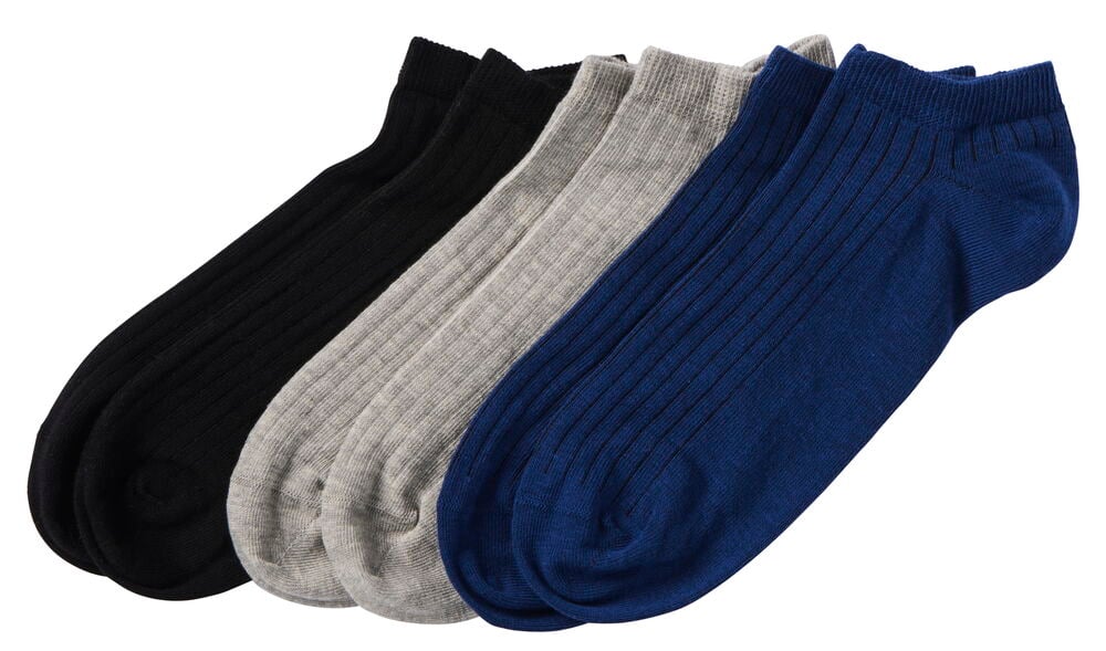 Vier Paar schwarze Knöchelsocken mit Etikett zusammengefaltet.