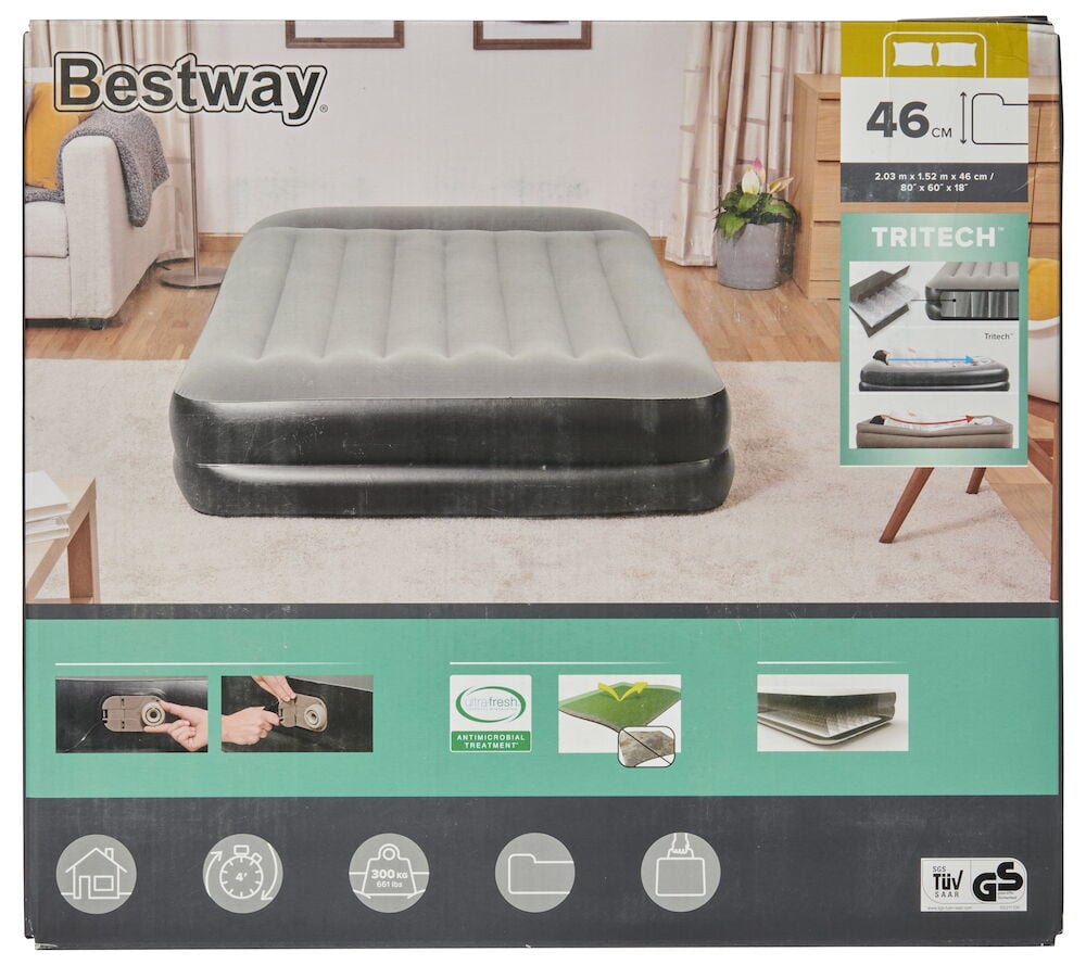 Aufblasbares Gästebett mit eingebauter Pumpe. Ergonomisch geformt und mit beflockter Oberseite. Perfekt im Sommerhaus und bei Übernachtungen.