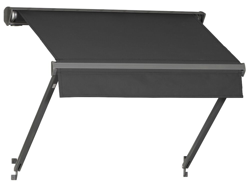 Fallarmmarkisen für Fenster mit in Europa hergestelltem Markisentuch aus spinngefärbtem Acryl. Lichtechtheit 7–8. 5 Jahre Garantie gegen Ausbleichen vor Sonne. Eine Halbkassette aus Aluminium bietet Schutz von oben. Arme und schützende Halbkassette aus Aluminium. Die Fenstermarkise wird direkt an der Wand oder im Fensterfutter montiert. Sie hat einen Ausfall von der Wand von 70 cm. Innen- und Außensteuerung.