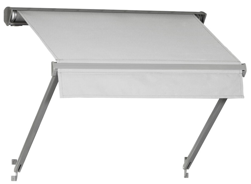 Fallarmmarkisen für Fenster mit in Europa hergestelltem Markisentuch aus spinngefärbtem Acryl. Lichtechtheit 7–8. 5 Jahre Garantie gegen Ausbleichen vor Sonne. Eine Halbkassette aus Aluminium bietet Schutz von oben. Arme und schützende Halbkassette aus Aluminium. Die Fenstermarkise wird direkt an der Wand oder im Fensterfutter montiert. Sie hat einen Ausfall von der Wand von 70 cm. Innen- und Außensteuerung.