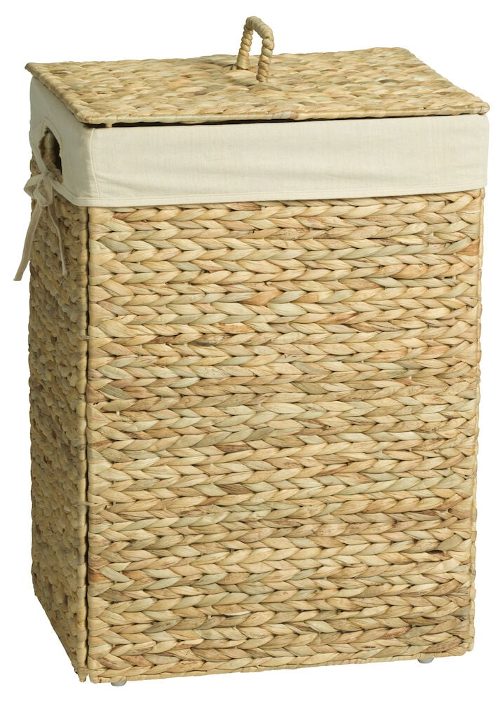 Der Waschkorb Marokko ist dekorativ aus geflochtenem Wasserhyazinthen gefertigt. Der Deckel ist vollständig abnehmbar; mit praktischer Innentasche aus Baumwolle, die sich leicht herausheben und separat in die Waschküche tragen lässt. Abmessungen: 55 cm × 40 cm × 50 cm. Fassungsvermögen ca. 60 l.