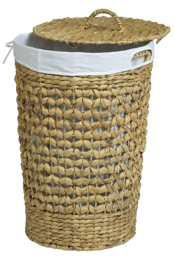 Wäschekorb mit Deckel, aus Wasserhyazinthe. Die Innenseite ist mit einem schützenden Stoff ausgekleidet, der abgenommen und gewaschen werden kann.