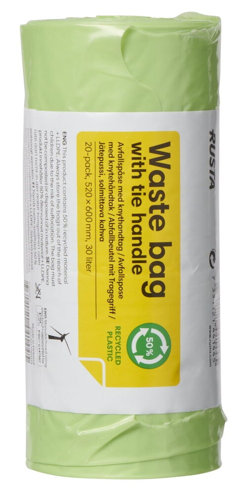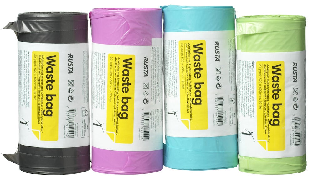 Müllbeutel aus 50% recyceltem Plastik. Fassungsvermögen 30 Liter. In verschiedenen Farben erhältlich, es wird stückweise und unsortiert verkauft.