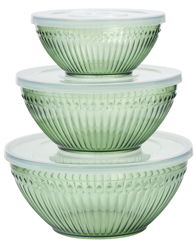 Dekorative Servierschalen aus transparentem PS-Kunststoff, die an klassische Pressglasschalen erinnern. Robust und stilvoll, für einen schönen gedeckten Tisch im Garten, beim Picknick oder im Wohnwagen. Deckel aus transparentem PPHP-Kunststoff zum Schutz des Inhalts. Der Deckel ist auch praktisch, wenn du Lebensmittel im Kühlschrank aufbewahrst. Set mit 3 stapelbaren Schalen in verschiedenen Größen: 1 Liter, 2 Liter und 3 Liter. Maße: 17,5×8 cm, 22×10 cm und 25×11 cm.