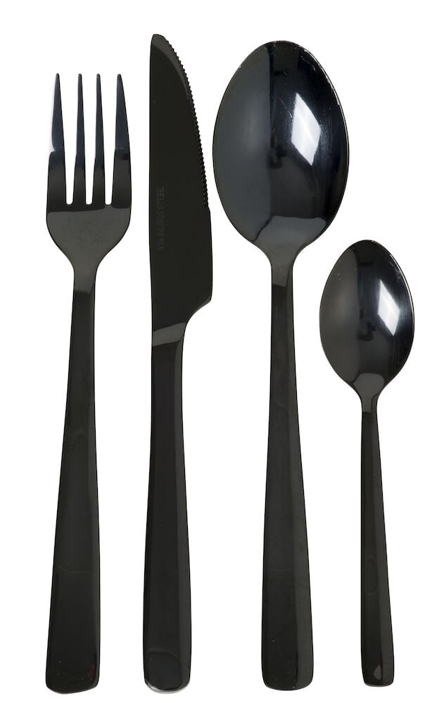 Besteckserie aus Edelstahl. 16 Teile mit 4 Gabeln, 4 Messern, 4 Esslöffeln und 4 Kaffeelöffeln. Nicht spülmaschinengeeignet.