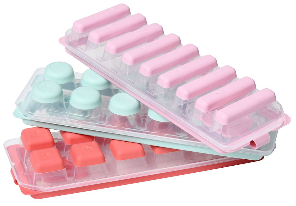 Eiswürfelbehälter mit praktischem Deckel, der das Befüllen und Verschließen erleichtert und ein Verschütten beim Einlegen in den Gefrierschrank verhindert. Zudem hat der Behälter einen weichen Boden, um die Eiswürfel leichter einzeln herausdrücken zu können. Erhältlich in drei schönen Farben, verschiedenen Formen und Eiswürfelgrößen. Spülmaschinenfest.