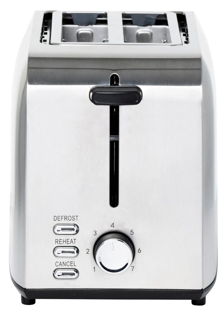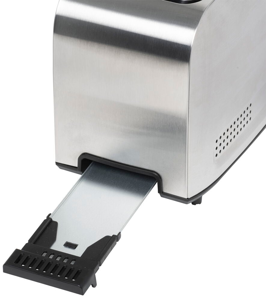 Retro-Toaster aus Edelstahl für zwei Scheiben Toast. Ausgestattet mit Auftau-, Toast- und Stoppfunktion. 7 wählbare Röstgrade, einfach einstellbar mit dem durchsichtigen Knopf auf der Stirnseite. Eine praktische Krümelschublade erleichtert die Reinigung. Intelligente Kabelaufbewahrung auf der Unterseite. Leistung: 750 W.