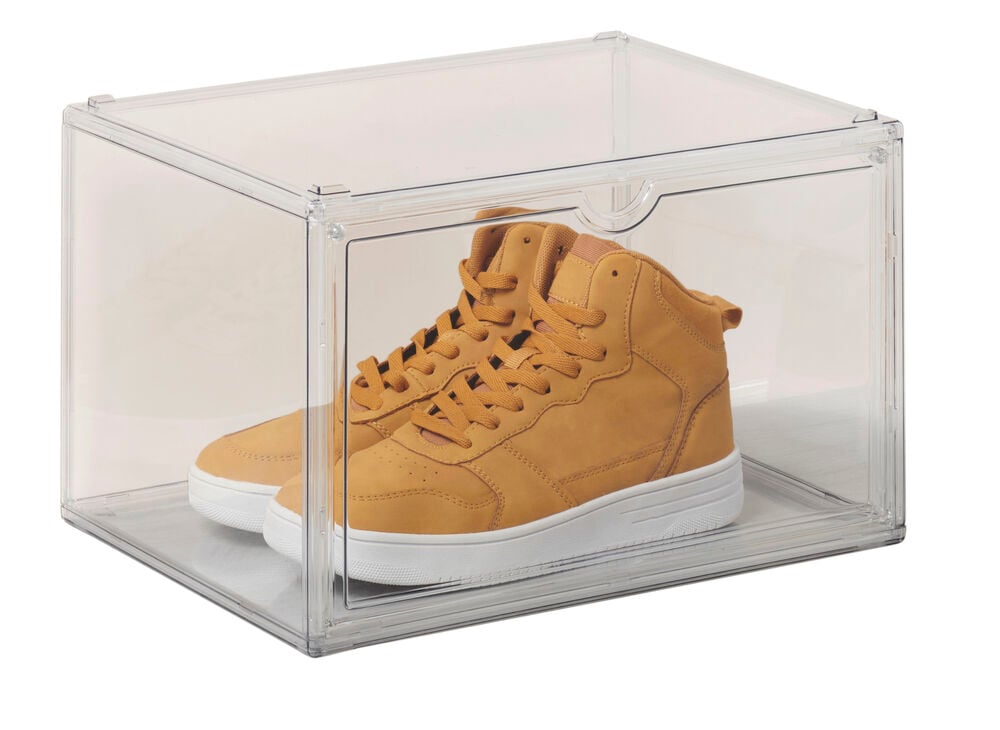 Mit der Display-Schuhaufbewahrung wird es einfach, Ordnung in Flur und Kleiderschrank zu schaffen. Wenn alle Dinge ihren festen Platz haben, wird das Sortieren und Aufräumen zum Kinderspiel. Du sparst Zeit, da du nicht ständig nach dem suchen musst, was du brauchst. Der vielseitige Display-Behälter kann verwendet werden, um alles von Sneakers, Sandalen und eleganten Schuhen bis hin zu Taschen, Mützen und Kappen aufzubewahren. Das schlichte Design der Aufbewahrungsbox fügt sich mühelos in verschiedene Einrichtungsstile ein. Halte deine Schuhe und Accessoires griffbereit und schaffe eine ordentliche und praktische Aufbewahrungslösung, die deinen Alltag erleichtert.
