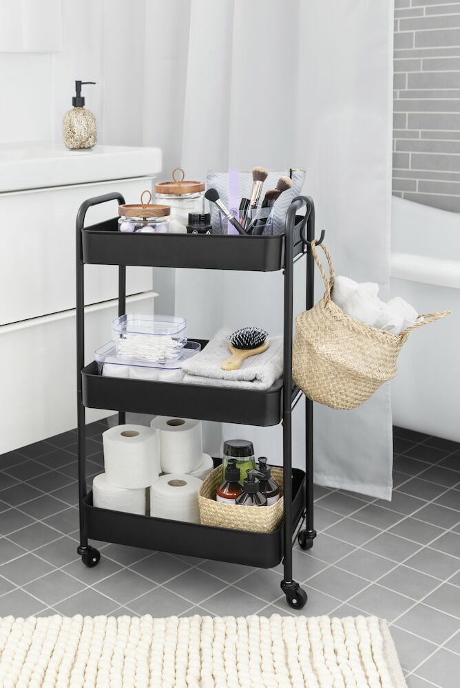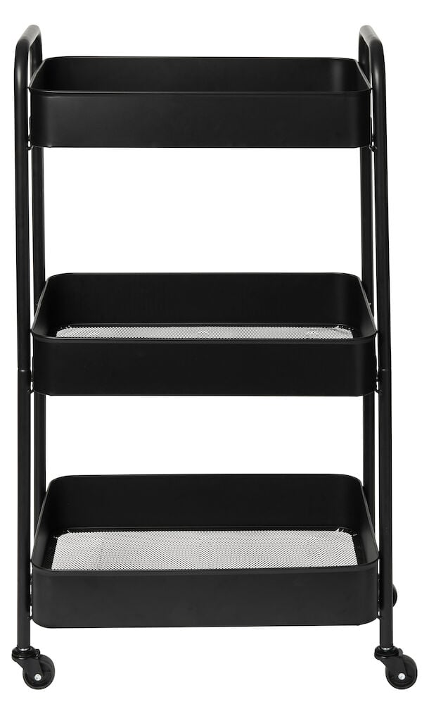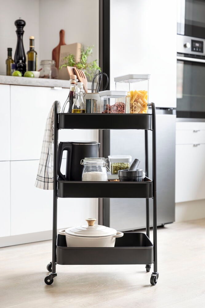 Diese große Version des Rollwagens Vera bietet dir noch mehr praktischen, stilvollen Stauraum. Mit einer Größe von 78x46x31 cm und drei geräumigen Metallablagen ist dieser Rollwagen ein stabiler Helfer, der so gut wie alles packt – von Küchenutensilien über Handtücher bis hin zu Büromaterial und Kosmetikprodukten. Erhältlich in zwei modernen Farben: Schwarz und Rosa – so kannst du genau den Ton wählen, die am besten zu deinem Stil passt.
