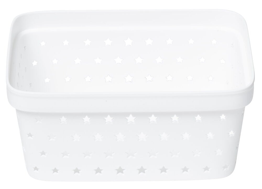 Weiße, rechteckige Plastikkorb mit Griffen und Lochmuster.