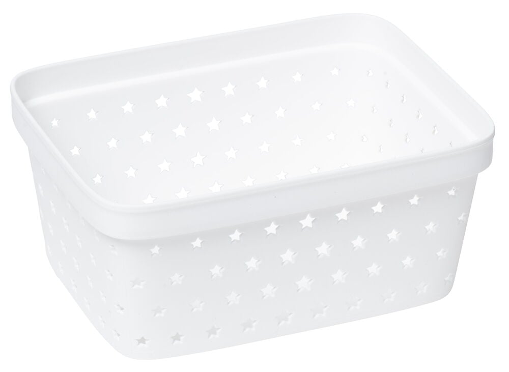 Weiße Aufbewahrungsbox mit Lochmuster und integrierten Griffen.