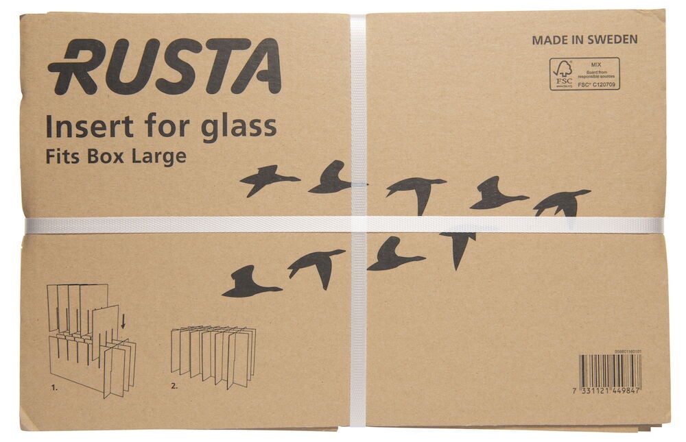 Bei Rusta findest du Verpackungsmaterialien, die für die Aufbewahrung größerer und schwerer Gegenstände oder für den Umzug verwendet werden können. Wähle den Umzugskarton nach Art des von dir zu verpackenden Inhalts und schütze deine Gegenstände mit Luftpolsterfolie oder Seidenpapier. Unser großer Umzugskarton Large schützt deine Gläser während des Umzugs, indem du einen praktischen Einsatz hinzufügst. Unsere Umzugskartons sind in verschiedenen Größen erhältlich. Sie sind auch dann stabil und standfest, wenn sie gestapelt werden. Unsere einzigartige Verschlussfunktion, bei der die Griffe zum Verschließen der Box beitragen, sorgt für einen festeren Halt, erleichtert das Anheben und macht das Tragen angenehmer. Rustas Umzugskartons werden in Schweden hergestellt und sind FSC-zertifiziert.