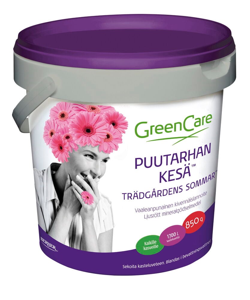 GreenCare Puutarhan Kesä on aito ja alkuperäinen, vaaleanpunainen kastelulannoite, joka antaa kukkiville kasveille näyttävän, pitkäkestoisen kukinnan ja tuottaa kasvimaalla runsaan, maukkaan sadon. GreenCare Puutarhan Kesä sopii kaikille koriste- ja hyötytarhan kasveille. Veteen sekoitettavan Puutarhan Kesän ravinteet ovat kasvien käytössä nopeasti. Käytä myös huonekasveille.