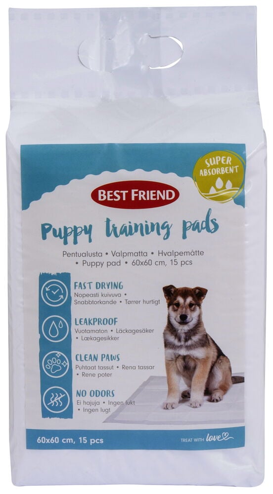 Best Friends valpematte er et godt hjelpemiddel når du skal hjelpe valpen til å bli husren. Valpematter, som også kalles "puppy pads", har ekstra holdbar og slitesterk overflate som står imot angrep fra selv de viltreste valper, samtidig som den holder væsken innkapslet. Det tynne plastbelegget i bunnen hindrer dessuten at væsken lekker ut av underlaget. Dermed holder underlaget poter og gulv tørre, slik at hjemmet holdes ordentlig, hygienisk og luktfritt. I tillegg til valper passer mattene også til syke, rekonvaleserende eller gamle hunder og katter som har problemer med å holde seg, eller til bruk under tispen og valpene i valpekassen. Underlaget kan også brukes for å beskytte møbler, eller i bunnen av transportburet på reise. Størrelsen på underlaget er 60x60 cm, i 15-pakning.