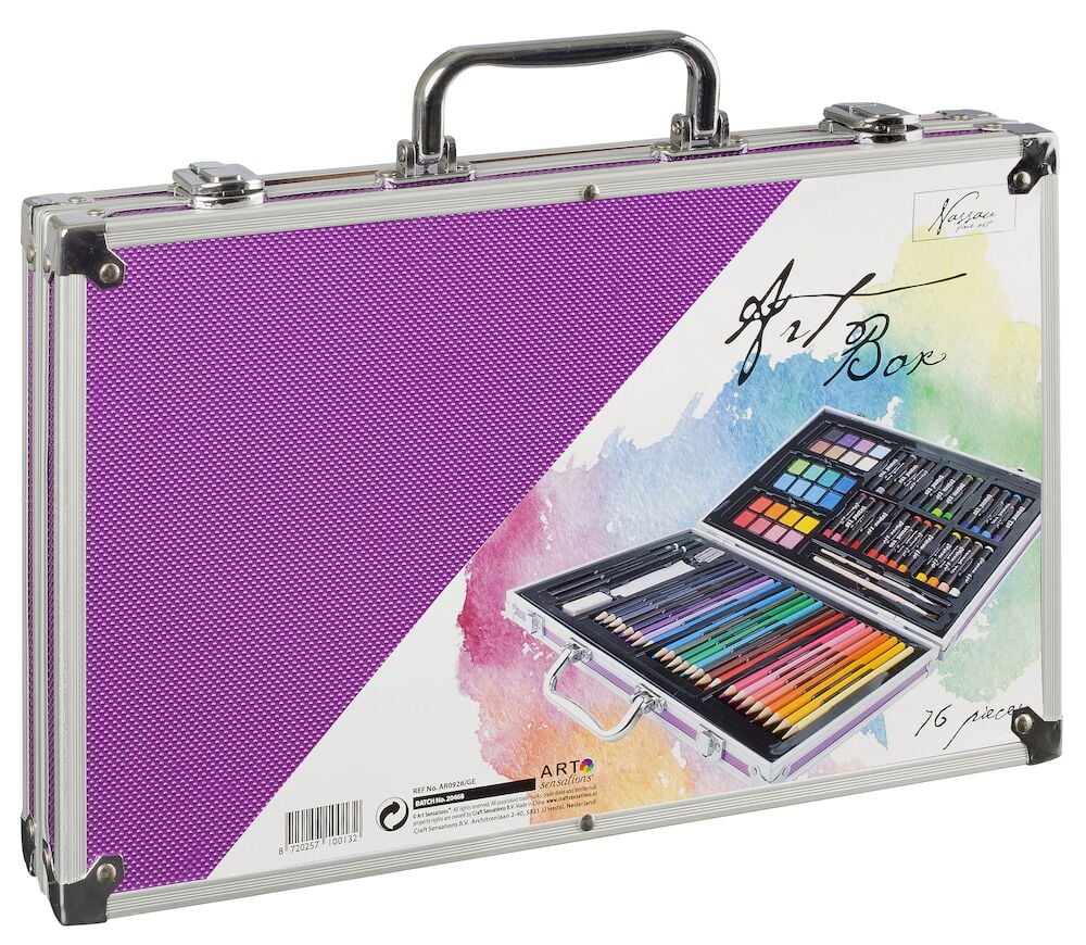 Velfylt kunstnereske fra Nassau Fine Art, perfekt for den kreative! Veske av metall, med et praktisk håndtak og to låser, slik at den holder seg lukket. Her finner du alt du trenger til forskjellige kunstprosjekter både når du skal male, tegne og fargelegge. Inneholder 24 fargeblyanter, 24 oljepasteller (kritt), 24 vannfarger, 2 pensler, 2 blyanter og mye mer.
