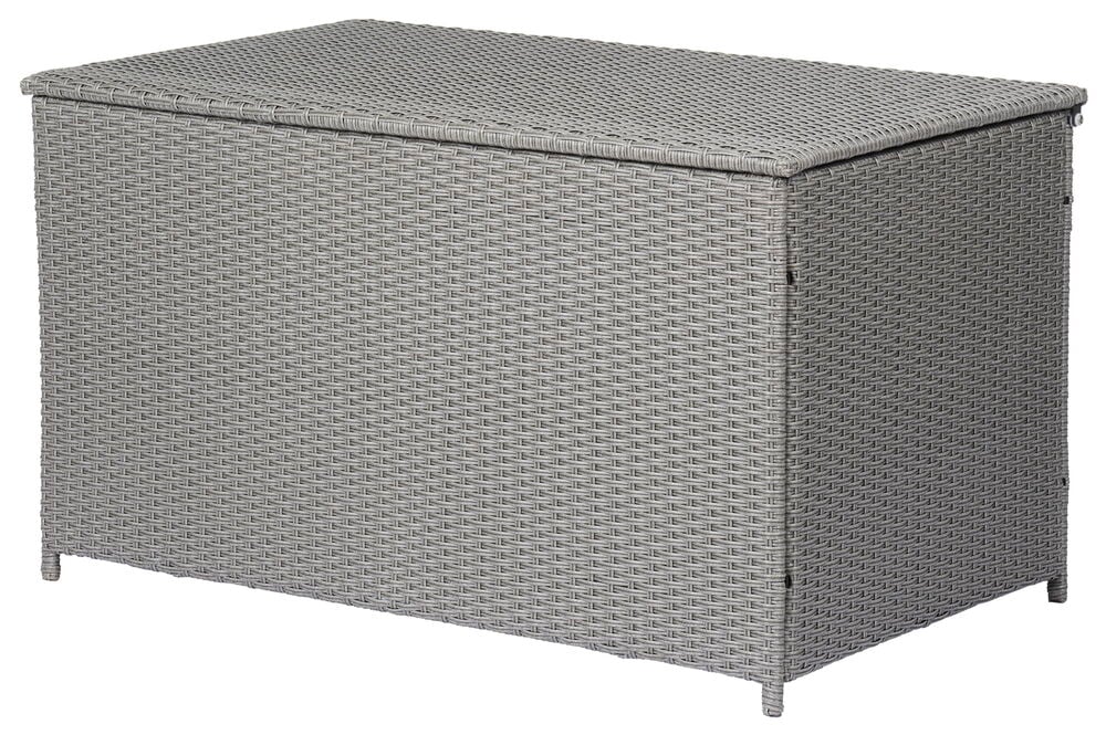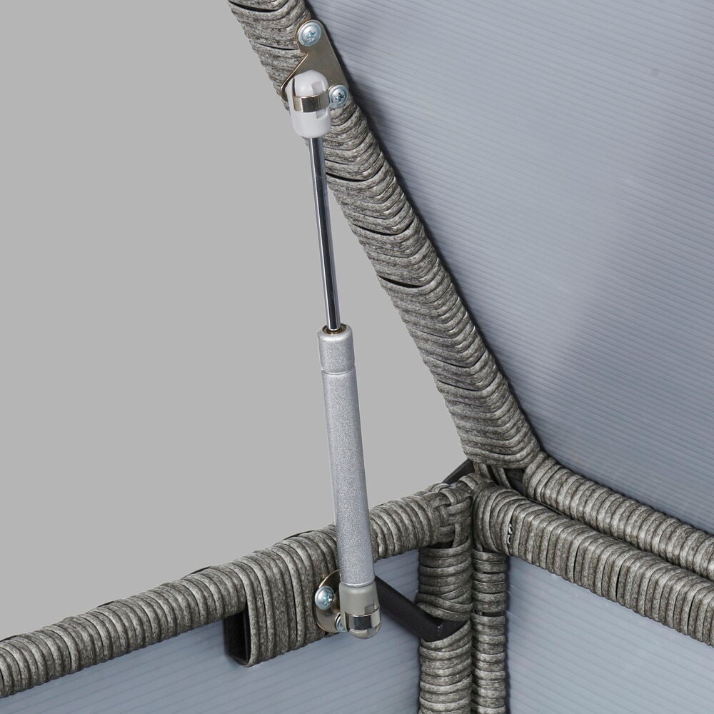 Funksjonell pute- og oppbevaringskasse av håndflettet PE-plast, hvorav 50% er resirkulert materiale. Utstyrt med en gassfjær for enkel åpning og lukking. Perfekt for å oppbevare puter, leker, hageutstyr og verktøy på en stilren og organisert måte.
