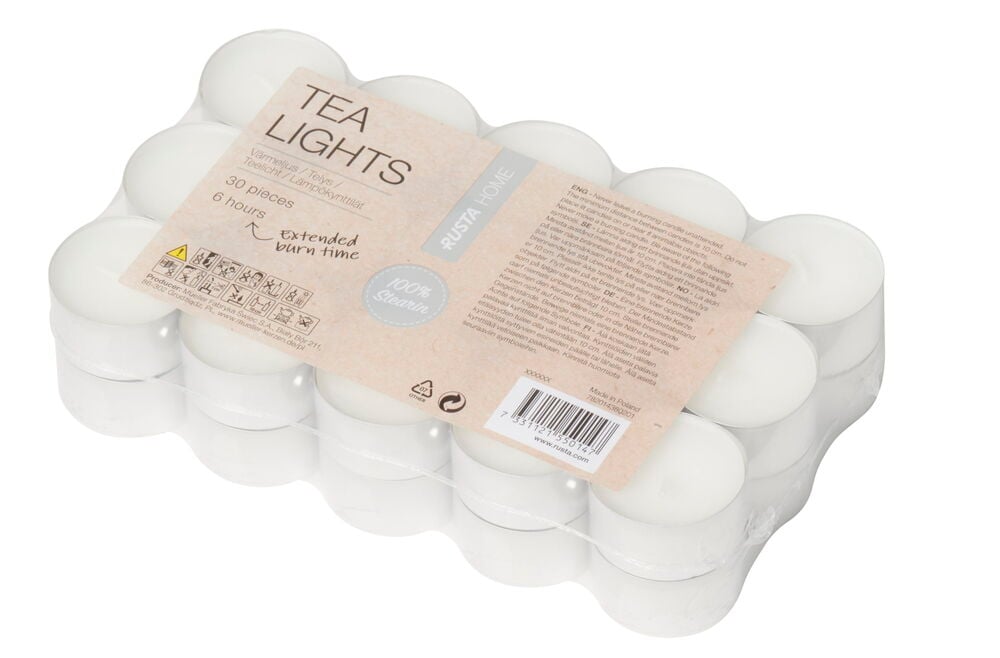 Skap en varm og hyggelig atmosfære med våre lys i 100 % stearin. Perfekte til både hverdag og fest! Telysene kommer i en praktisk 30-pakning og tilbyr en lang brenntid på ca. seks timer, slik at du og familie og venner kan nyte den vakre gløden lenge. Den høye kvaliteten på stearinen gir en renere forbrenning og et jevnt lys. Plasser dem i en pen lysestake, og la lysene spre et hyggelig og innbydende lys hele kvelden.