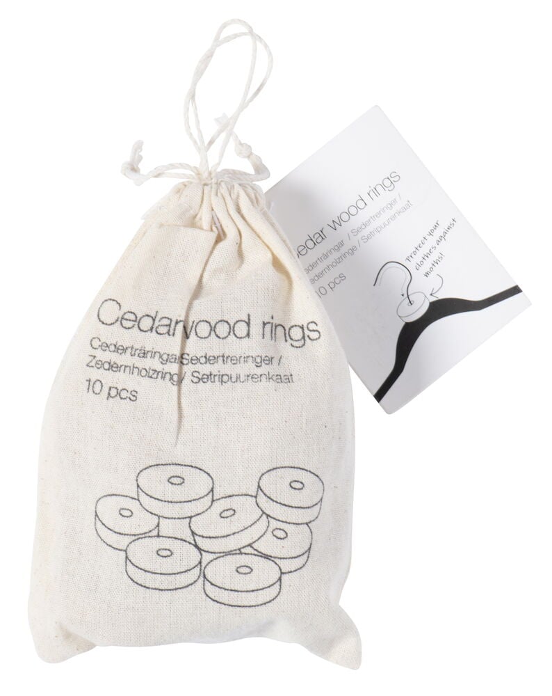 Ringer i sedertre dufter godt og frisker opp i klesskapet. Sedertreringer brukes som en naturlig beskyttelse mot skadeinsekter som møll eller pelsbiller. Ringene kan henges på kleshengeren eller legges i klesskapet. Når duften avtar, kan du slipe lett med fint sandpapir.