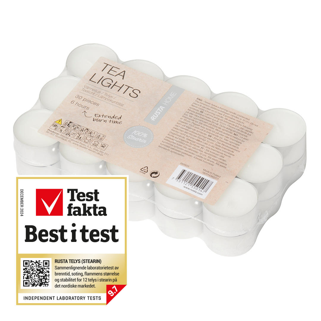 Våre telys av 100 % stearin har blitt kåret til best i test i Testfaktas store test. Testfakta har laboratorietestet tolv ulike typer telys av stearin som representerer de mest vanlige merkene på det nordiske markedet – og funnet en klar vinner. Brenntid, flammestørrelse, flammestabilitet og sotutslipp var parametrene som ble målt.