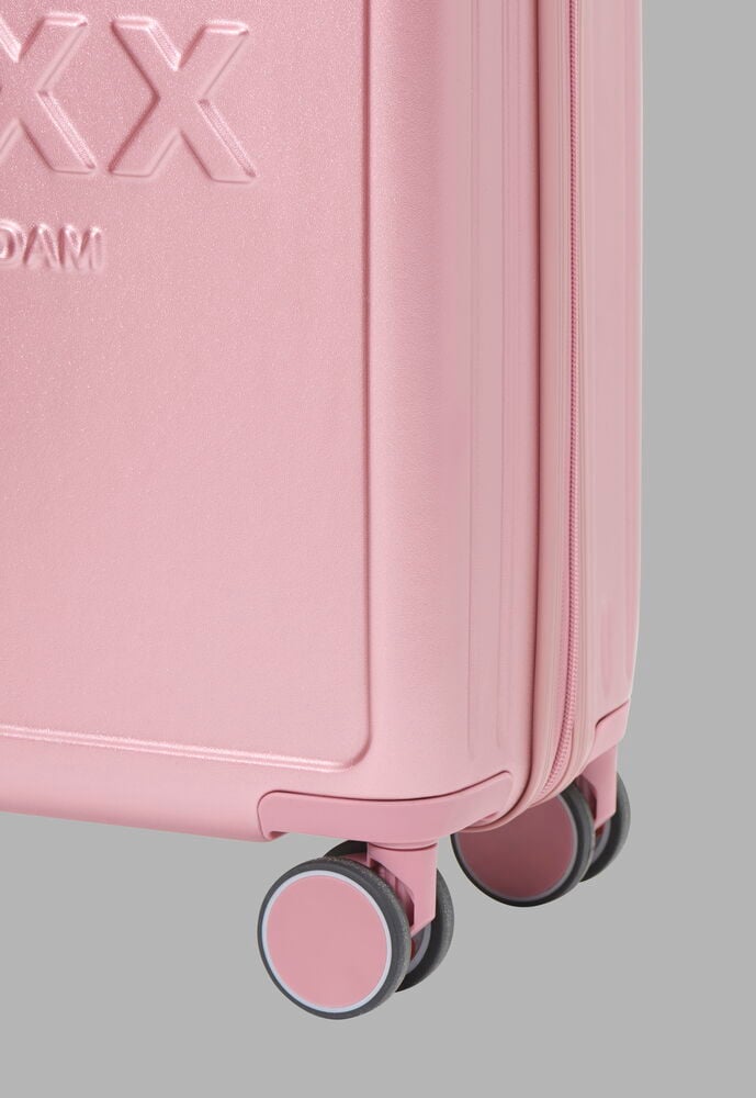 Rosa stor resväska med fyra hjul och teleskophandtag.