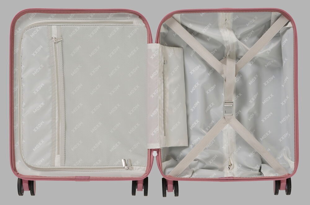 Rosa kabinväska med fyra hjul och teleskophandtag.