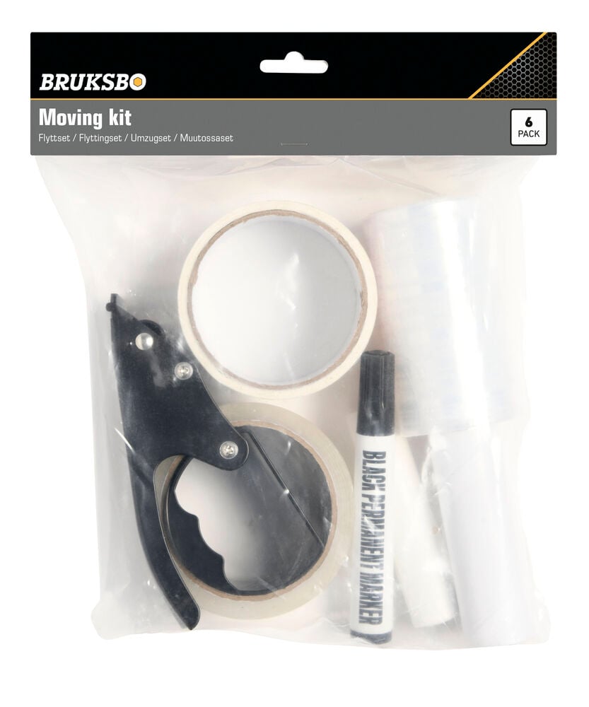 Allt du behöver till flytten! Gör arbetet med att flytta så enkelt som möjligt. Rätt verktyg och tillbehör underlättar stort. I flyttsetet ingår det viktigaste du behöver för att kunna packa dina ägodelar på ett smidigt och säkert sätt: 1 st sträckfilm (10 cm x 80 m), 1 st packtejp märkt med ”Ömtåligt” (5 cm x 25 m), 1 st packtejp (5 cm x 10 m), 1 st tejpdispenser, 1 st rulle med 50 st neutrala klisteretiketter 4 x 10 cm samt 1 st markörpenna.