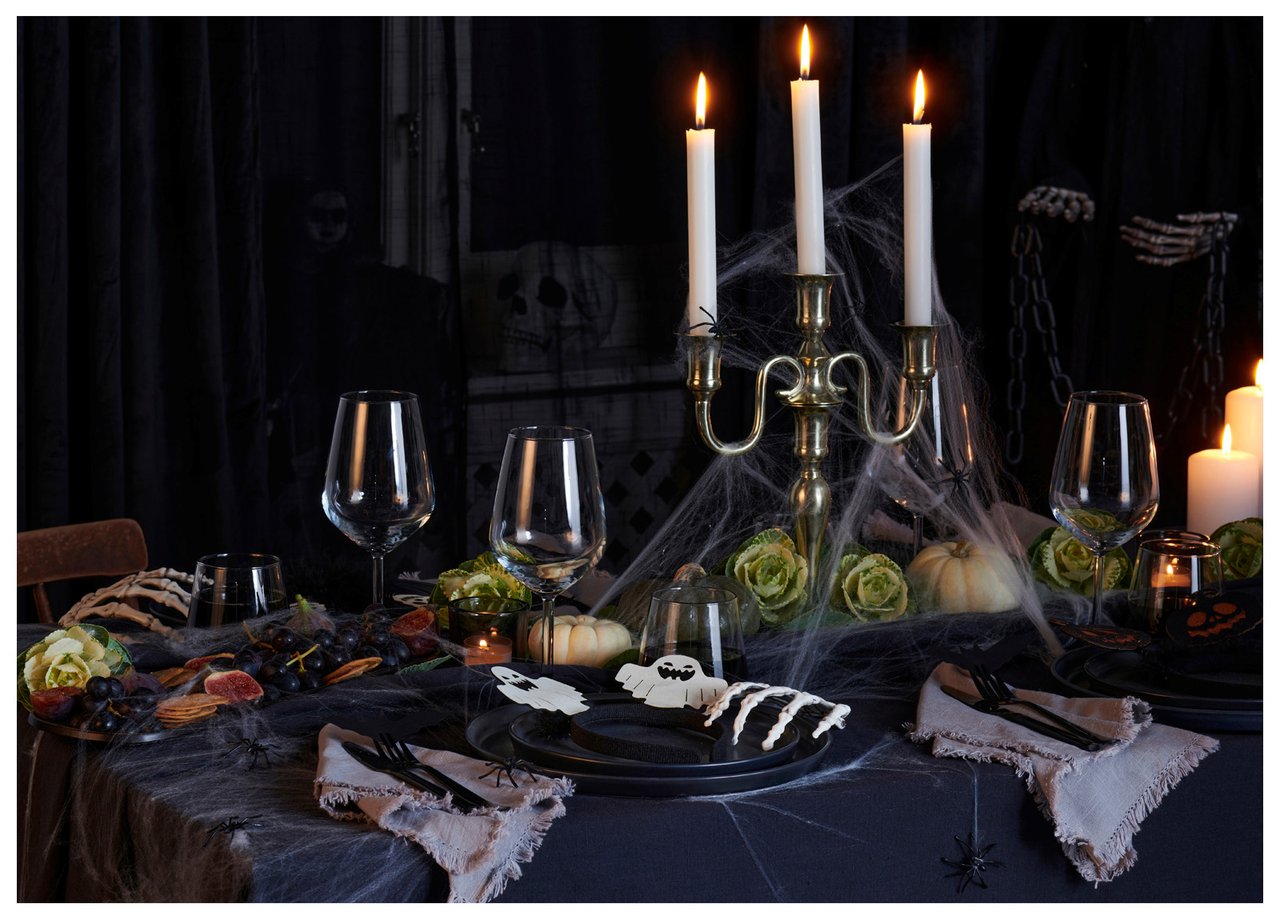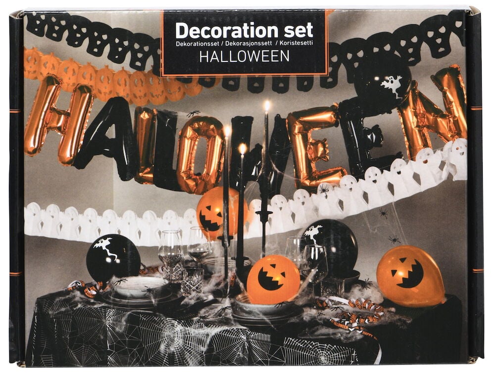 En halloweenmiddag kräver rysligt bra dukning och dekorationer. Jobba fram spökstämningen med girlanger, ballonger, spindlar (frys in i isbitar!) och spindelnät. Varför inte ta en genväg med vårt dekorationsset? En fullproppad partybox med allt du behöver för halloweendukningen.
