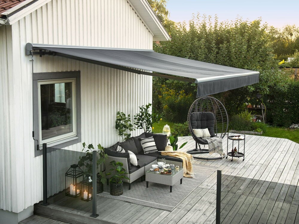 Grå motoriserad terrassmarkis monterad ovanför uteplats.
