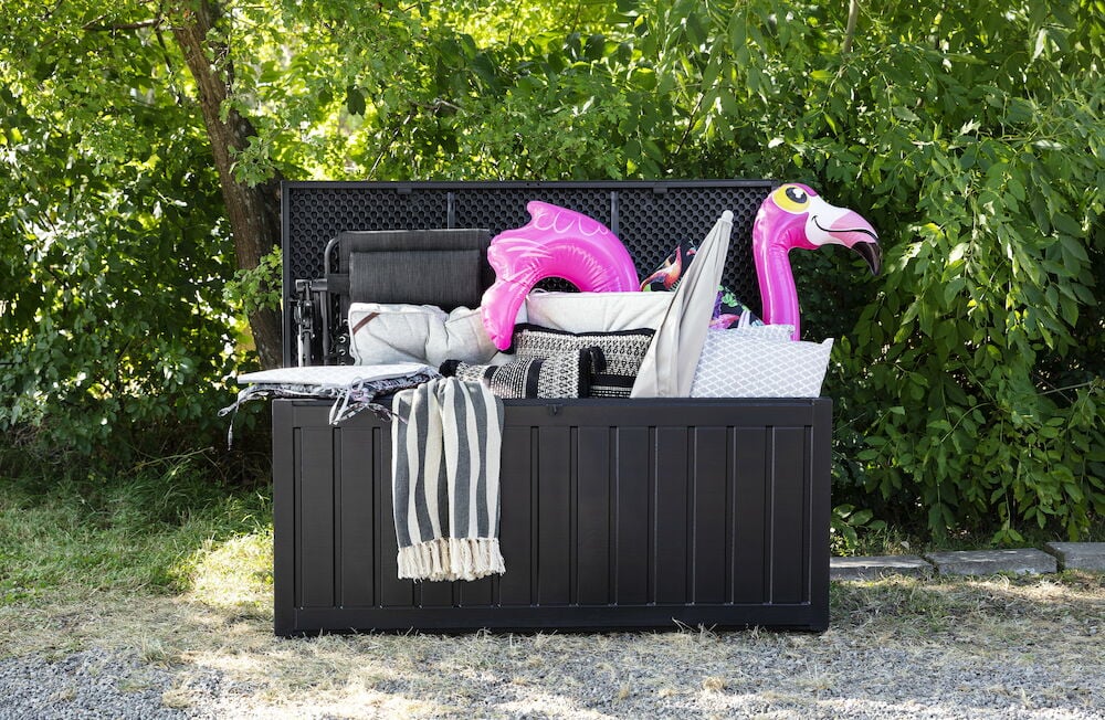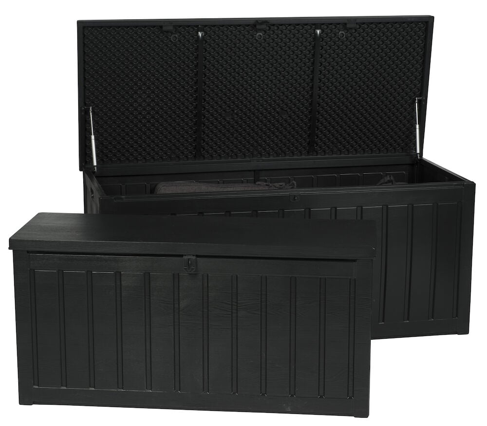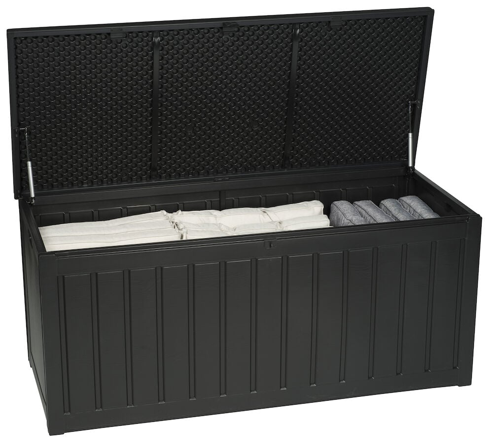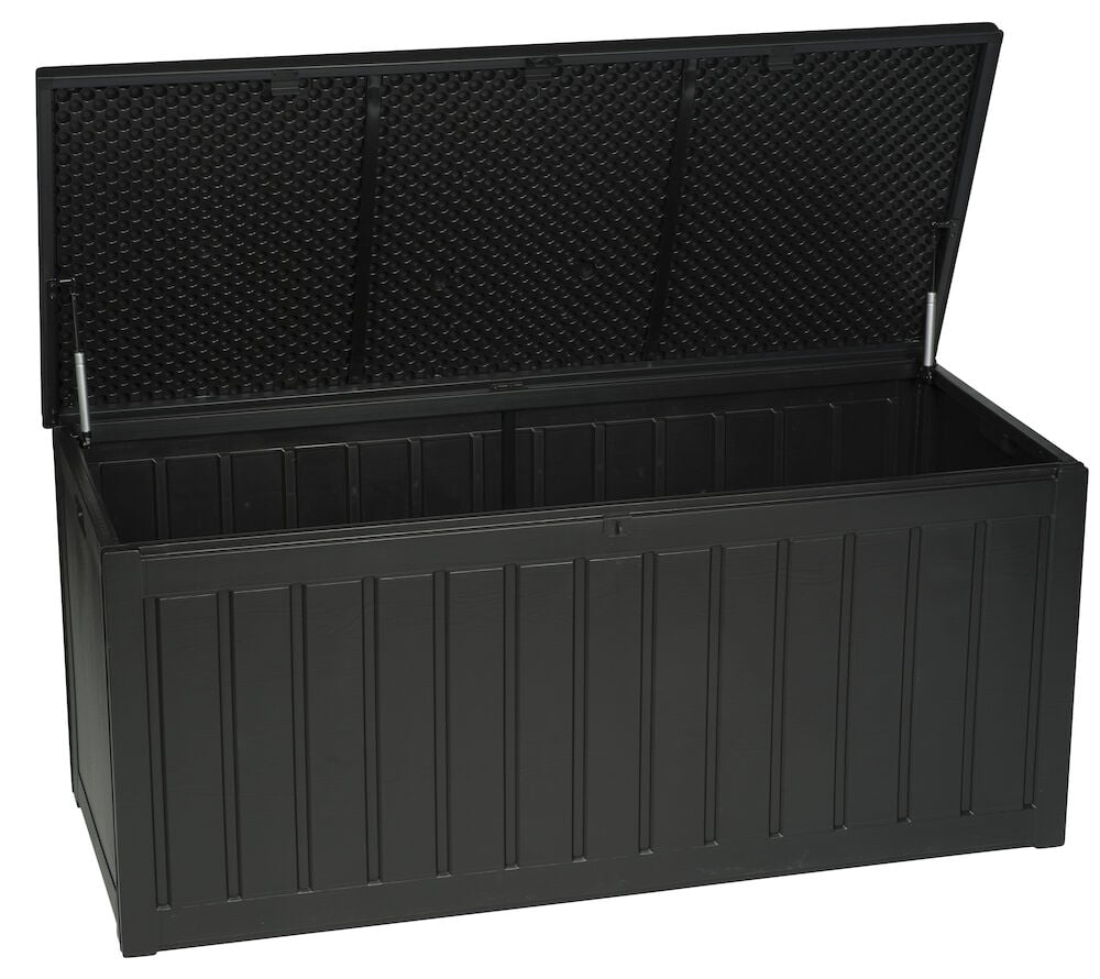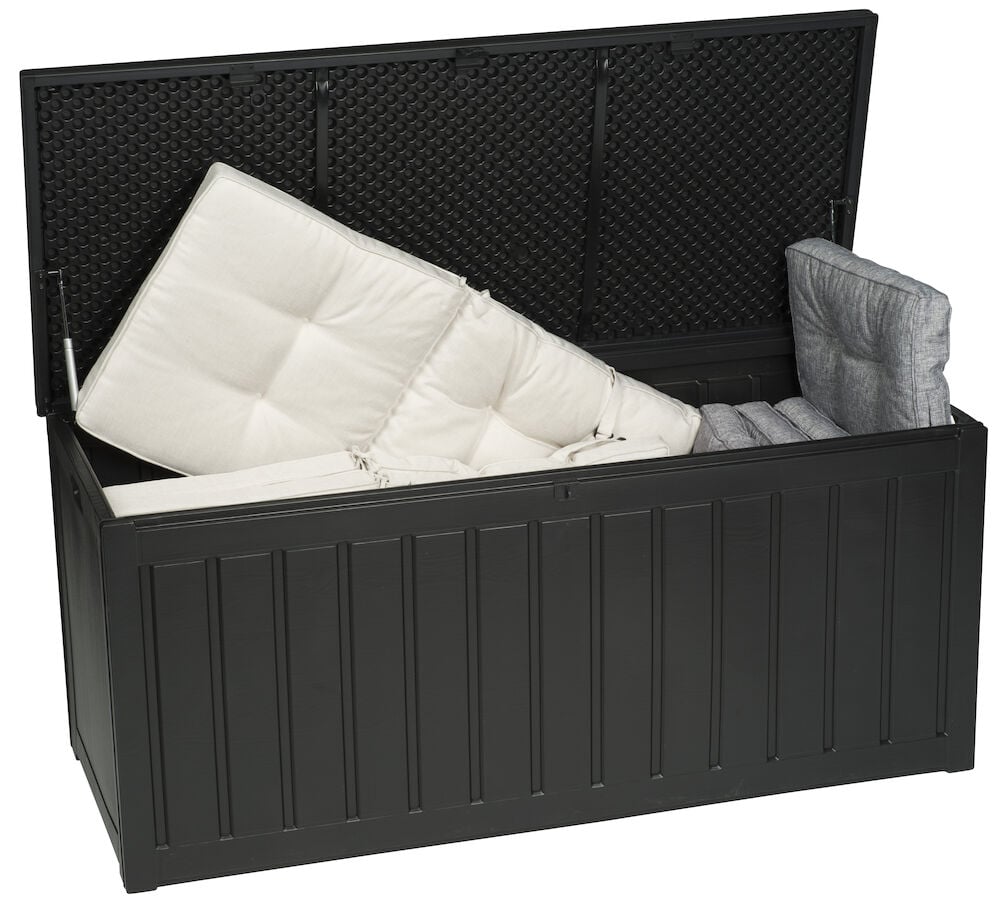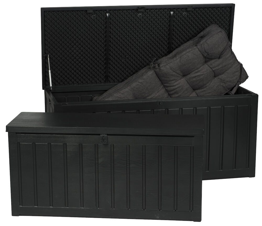 Praktisk förvaringslåda med kraftig konstruktion i plast för dynor, leksaker, trädgårdsredskap och verktyg. Lådans innermått: 140 cm bred, 57/60 cm djup (grundaste/djupaste delen) och 57/60 cm hög (lägsta/högsta delen). Locket har gasfjädring för enklare öppning och stängning.
